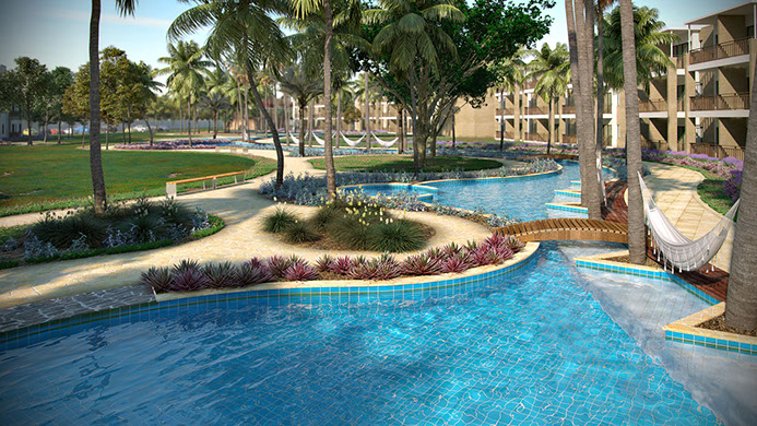 Projeto arquitetônico de um complexo hoteleiro e de um condomínio residencial multifamiliar. Empreendimento que, além de toda a estrutura que concerne às duas tipologias, com satisfatória área de lazer composta de piscina e de quadras de tênis e poliesportiva, prima pela boa relação entre homem e natureza, com vasta área verde permeável para convivência e recreação, SPA e jardim paisagístico.