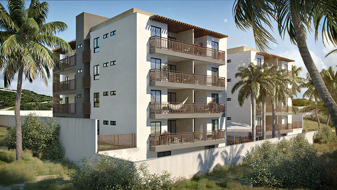 Condomínio residencial multifamiliar, composto de 02 (dois) blocos de apartamentos, térreo e mais três pavimentos, com 03 unidades residenciais por pavimento, em duas opções de planta baixa, sendo uma com 58,64m² e outra com 63,39m² somando um total de 30 unidades residenciais. Localizado em na Praia do Cumbuco – Caucaia - CE.