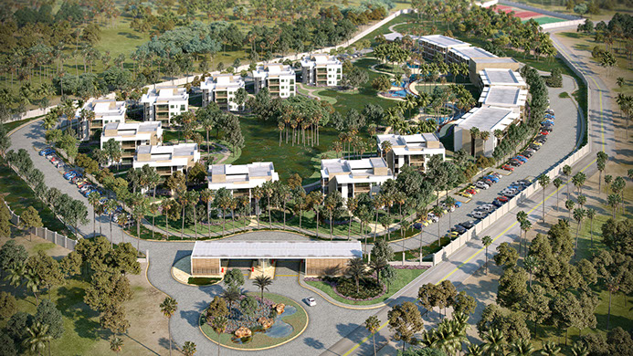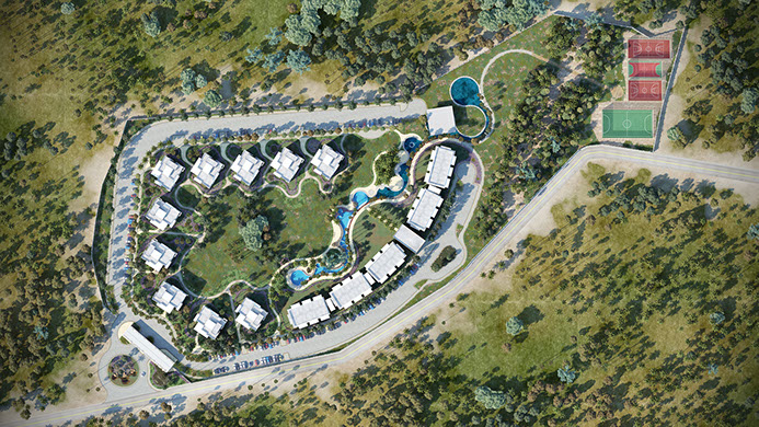 Projeto arquitetônico de um complexo hoteleiro e de um condomínio residencial multifamiliar. Empreendimento que, além de toda a estrutura que concerne às duas tipologias, com satisfatória área de lazer composta de piscina e de quadras de tênis e poliesportiva, prima pela boa relação entre homem e natureza, com vasta área verde permeável para convivência e recreação, SPA e jardim paisagístico.