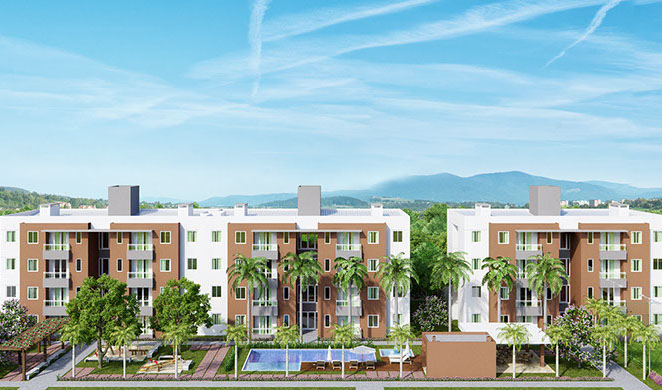 Condomínio residencial multifamiliar, composto de 02 (dois) blocos de apartamentos, térreo e mais três pavimentos, com 12 unidades residenciais por pavimento, em cada bloco, somando um total de 96 unidades. Com áreas úteis de 44,15m² e 47,40m². Localizado em Paracuru – CE.