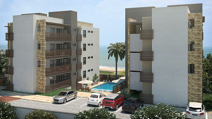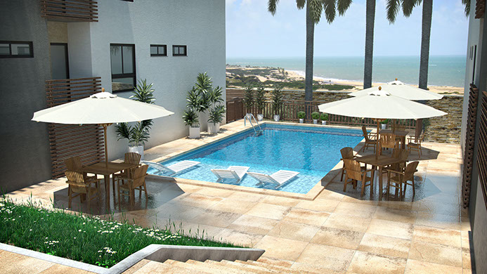 Condomínio residencial multifamiliar, composto de 02 (dois) blocos de apartamentos, térreo e mais três pavimentos, com 03 unidades residenciais por pavimento, em duas opções de planta baixa, sendo uma com 58,64m² e outra com 63,39m² somando um total de 30 unidades residenciais. Localizado em na Praia do Cumbuco – Caucaia - CE.